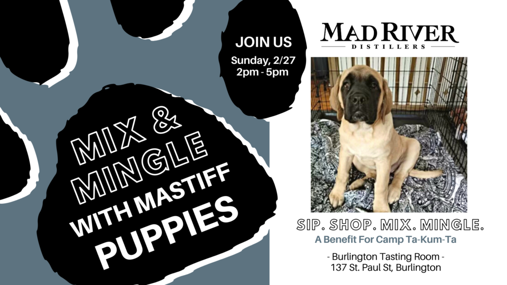Visit Mad River Distillers’ Burlington Tasting Room to help us raise money for Camp Ta-Kum-Ta, a wonderful camp that provides extraordinary experiences for children who have (or have had) cancer, as well as their families. Brian Carten, a Mad River Distillers employee and volunteer at Camp Ta-Kum-Ta, will be there to show off his new litter of Mastiff puppies (and future therapy dogs!).